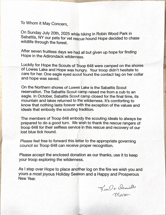What began as a summer wilderness adventure for Troop 648 became an unforgettable rescue mission. In July, during a self-organized canoe trek (planned and led by young Scout, Paul M.) through the Adirondacks, the Scouts encountered an unexpected visitor—a lost dog named Hope. Her owner had nearly given up hope of finding her, but thanks to quick thinking and teamwork, the troop made a difference.
