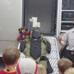The travelers enjoyed fishing, Leave No Trace training, games from India, arts and crafts, and archery. One of the highlights for the week was a trip to Volcano Island for some fun in the water. Another was a very special visit from the Loudoun County bomb squad. The bomb squad brought their truck, their bomb suit, a robot, and bomb sniffing dog.Two highlights of this demonstration were the dog and watching the robot disarm a “bomb” from Cubbie Bear’s backpack!