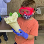 deploying and collecting data. I also had to figure out how to pull the parachute back up after each drop and how to stay at the top of the climbing tower and still be able to use my hands. The COPE teachers showed me how I could put my feet against the wall so I could use my hands. That was really cool! I had a looped cord all the way down that they tied the parachute on, so I could pull it up every time and I dropped the parachute 3 times. My mom took the hang time with a stopwatch and my friend Keefer checked the box to make sure it wasn’t damaged and to check the supplies inside. The box was still good after 3 drops, so my experiment was successful. After that I climbed down and we had to clean all the equipment we used with soap and water to make it safe for the next person to use.”